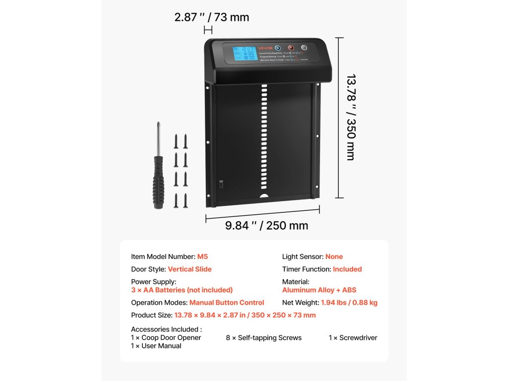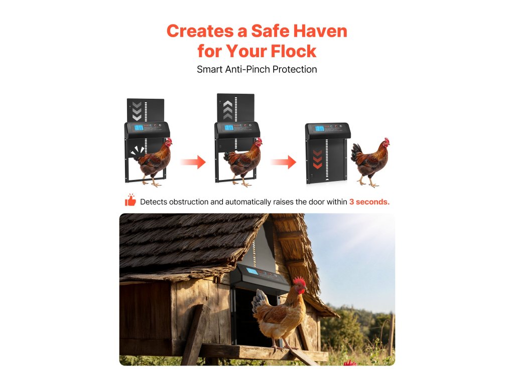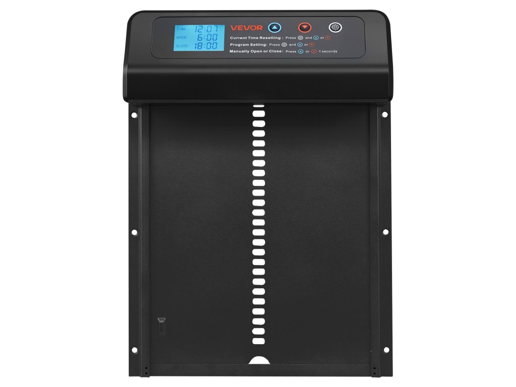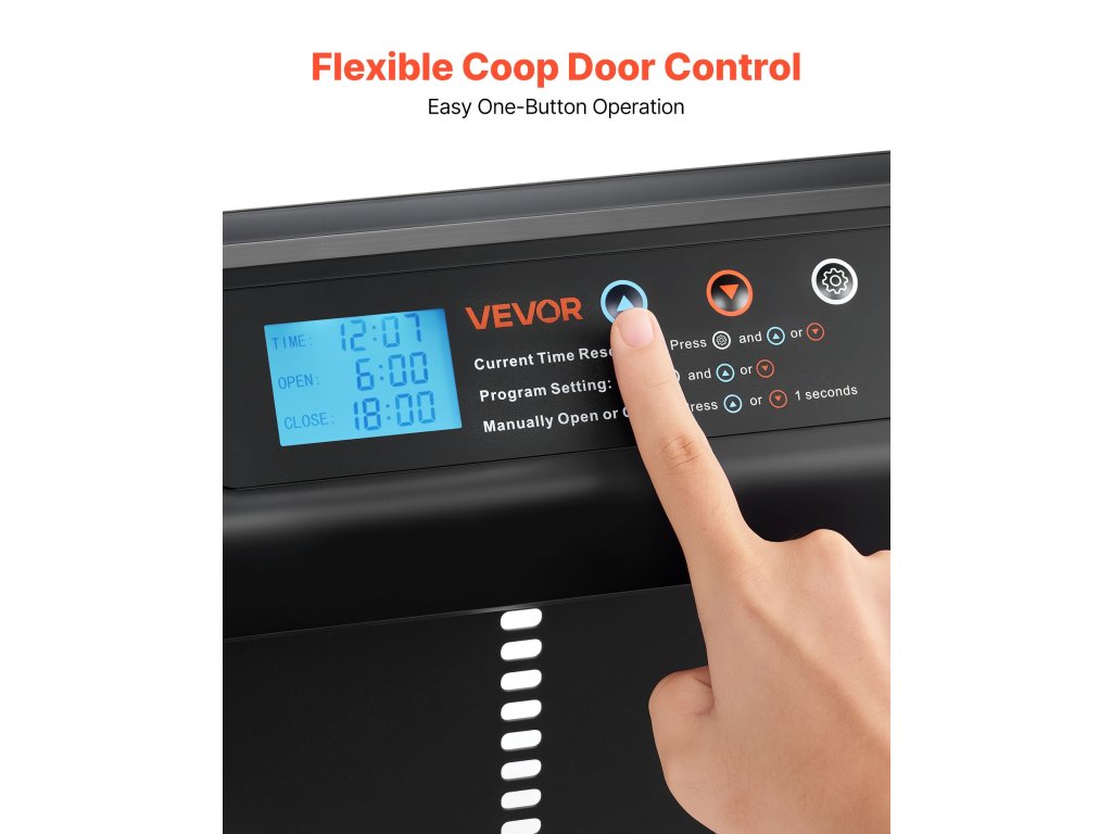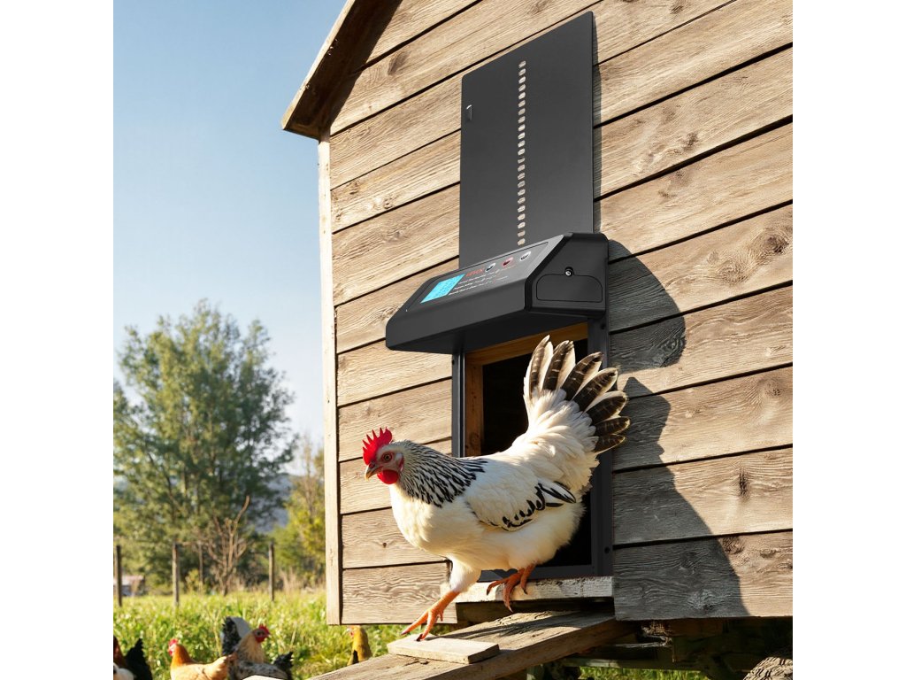 Ez a csirkeajtó nagyméretű kijelzővel van felszerelve, amely világosan mutatja az időt, az ajtó állapotát és a tervezett beállításokat. Az időzítők beállítása, az üzemmódok megváltoztatása vagy az állapot ellenőrzése egyszerű és intuitív.
