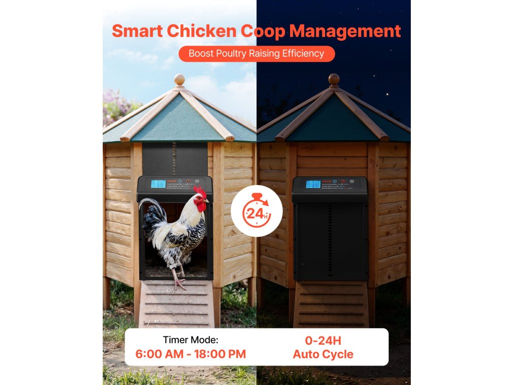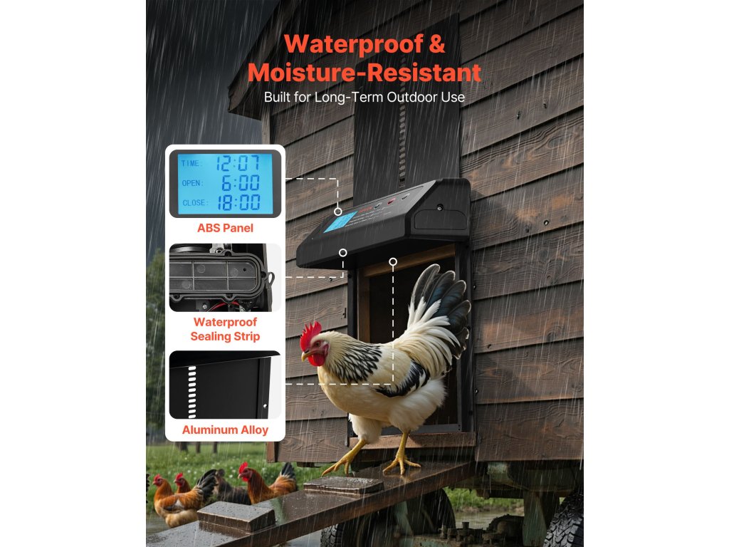 Az automata tűztér ajtó két intelligens üzemmóddal - időzítő és kézi üzemmód - rendelkezik a rugalmas vezérlés érdekében. A betörésgátló kialakítás biztosítja a csirkék biztonságos be- és kilépését. Vízálló és nedvességálló, így minden időjárási körülmények között megbízhatóan működik.