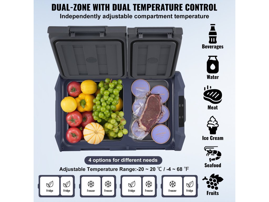 Autós hűtőláda 32 l, 2 zónás, kompresszoros, −4℉–68℉, 12/24V DC, 100-240V AC