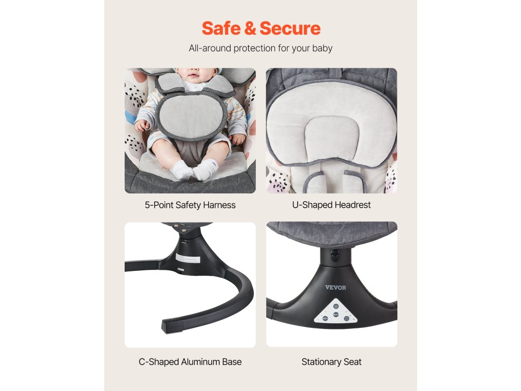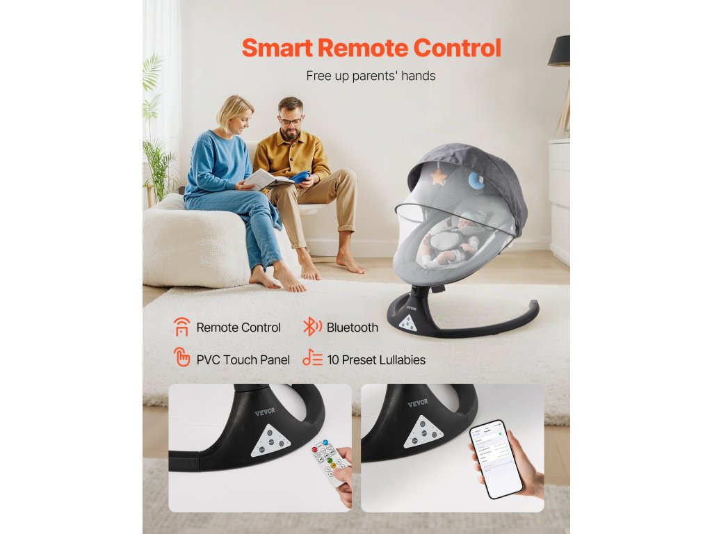 3 vezérlési lehetőséget kínál az Ön igényeinek megfelelően. A távirányító lehetővé teszi a zene és a hintázás sebességének távoli beállítását. Válasszon 10 előre beállított altatódal közül, vagy csatlakozzon Bluetooth-on keresztül, és játsszon le zenét telefonjáról ; A PVC érintőkijelző világosan mutatja a funkciókat, így az új szülők számára is könnyen kezelhető.