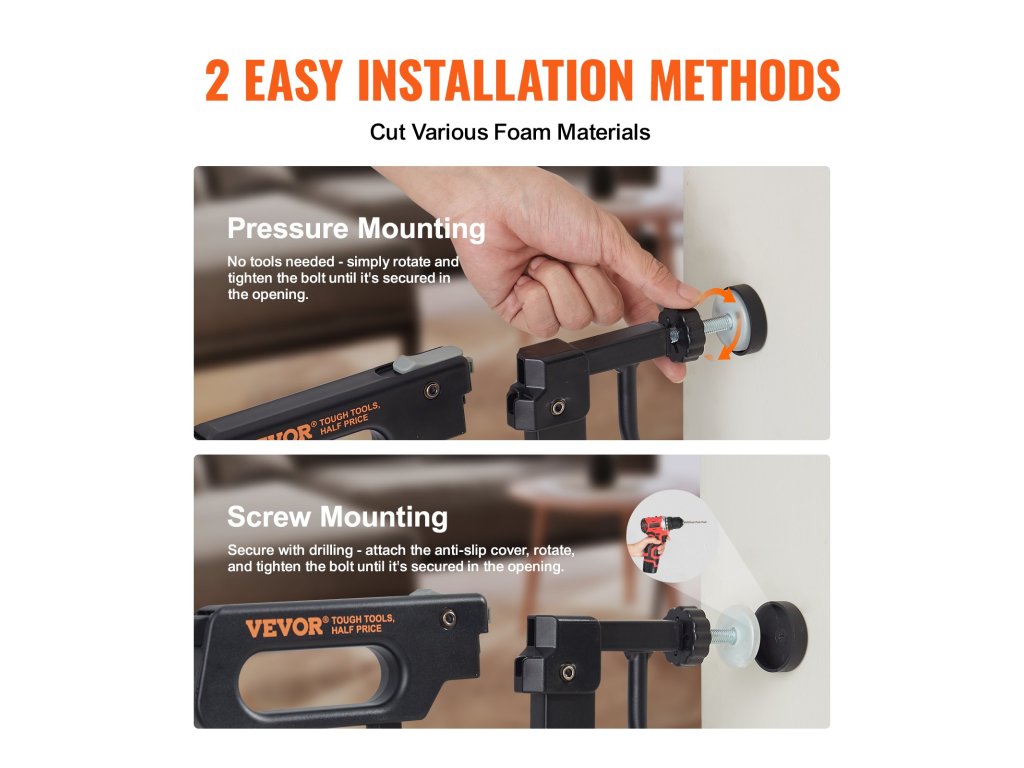 Válasszon a nyomásos vagy a hardveres rögzítés között. A nyomószereléssel megkíméli a falakat a fúrástól, és könnyen felszerelhető és leszerelhető. Lépcsők? A hardveres opciót ajánljuk.