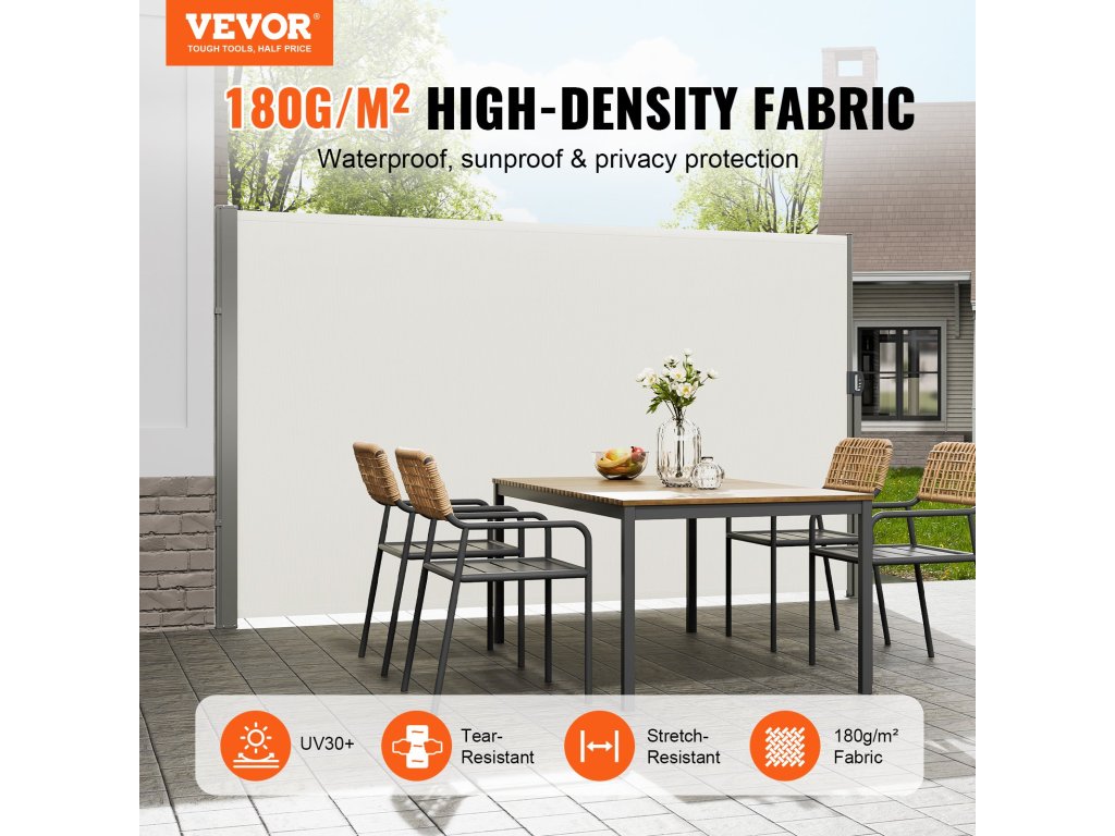 Az oldalsó napellenző 180 g/m²-es, nagy sűrűségű poliészterszövetet tartalmaz robusztus PU bevonattal, amely kiváló vízálló tulajdonságokat és szakítószilárdságot biztosít. Az UV30+ védelmi szintnek köszönhetően megvédi Önt és családját az UV-sugaraktól. Élvezze a szabadban való tartózkodást anélkül, hogy aggódnia kellene az időjárás miatt!