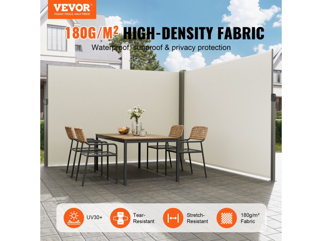 Az oldalsó napellenző 180 g/m²-es, nagy sűrűségű poliészterszövetet tartalmaz robusztus PU bevonattal, amely kiváló vízálló tulajdonságokat és szakítószilárdságot biztosít. Az UV30+ védelmi szintnek köszönhetően megvédi Önt és családját az UV-sugaraktól. Élvezze a szabadban való tartózkodást anélkül, hogy aggódnia kellene az időjárás miatt!