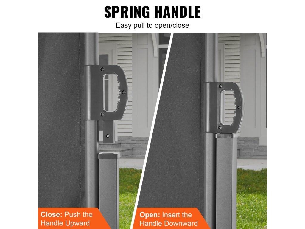 A kültéri adatvédelmi paraván egy könnyedén behúzható fogantyúval rendelkezik, amely rugós mechanizmussal rendelkezik, amely minden alkalommal biztosítja a sima és könnyű működést, amikor ki- vagy behúzza. Nincs szükség extra erőfeszítésre - csak egy gyengéd rántás, és máris élvezheti az azonnali árnyékot.