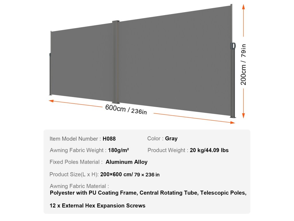 Behúzható oldalsó napellenző 79×236'' 180 g poliészter, vízálló UV 30+