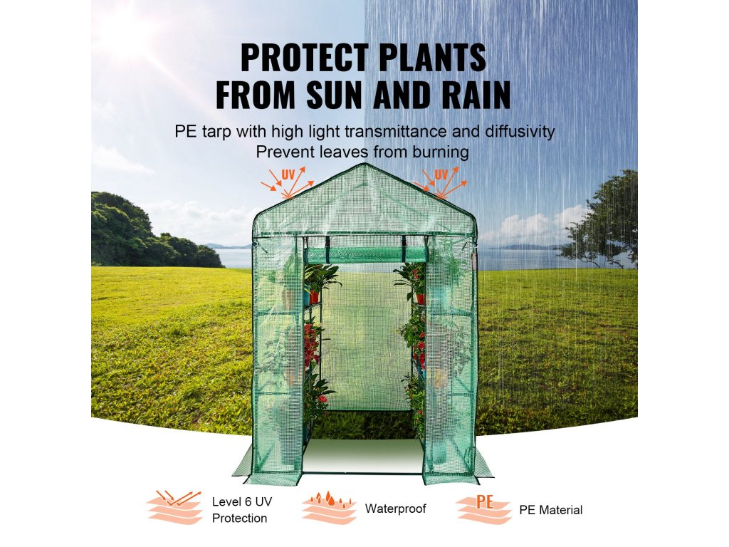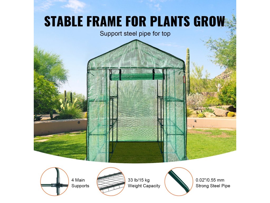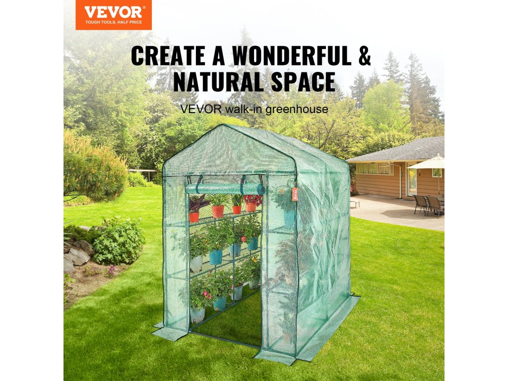 Pochôdzny skleník VEVOR poskytuje záhradníkom jednoduchý prístup. Môžete sa dostať dovnútra a voľne sa pohybovať. Vďaka tomu sa môžete pohodlne starať o svoje rastliny. Priestranný interiér umožňuje pestovanie viacerých rastlín; na police môžete umiestniť kvetináče a podnosy. Konštrukcia zabezpečuje optimálne využitie priestoru. Je ideálny pre tých, ktorí majú vo všeobecnosti obmedzený vonkajší priestor. Jednoduchý prístup vám umožňuje kedykoľvek sledovať vaše rastliny. Dobrá cirkulácia vzduchu pomáha udržiavať rastliny zdravé a prosperujúce. Vďaka dostatočnému priestoru môžete ľahko pestovať rôzne rastliny.