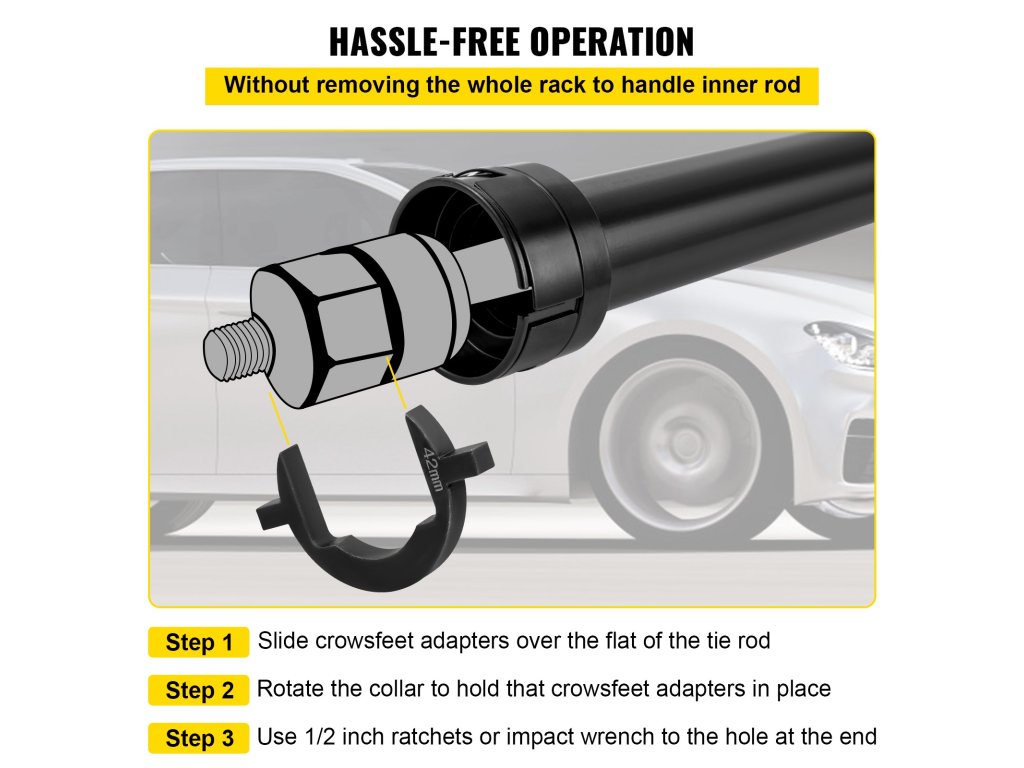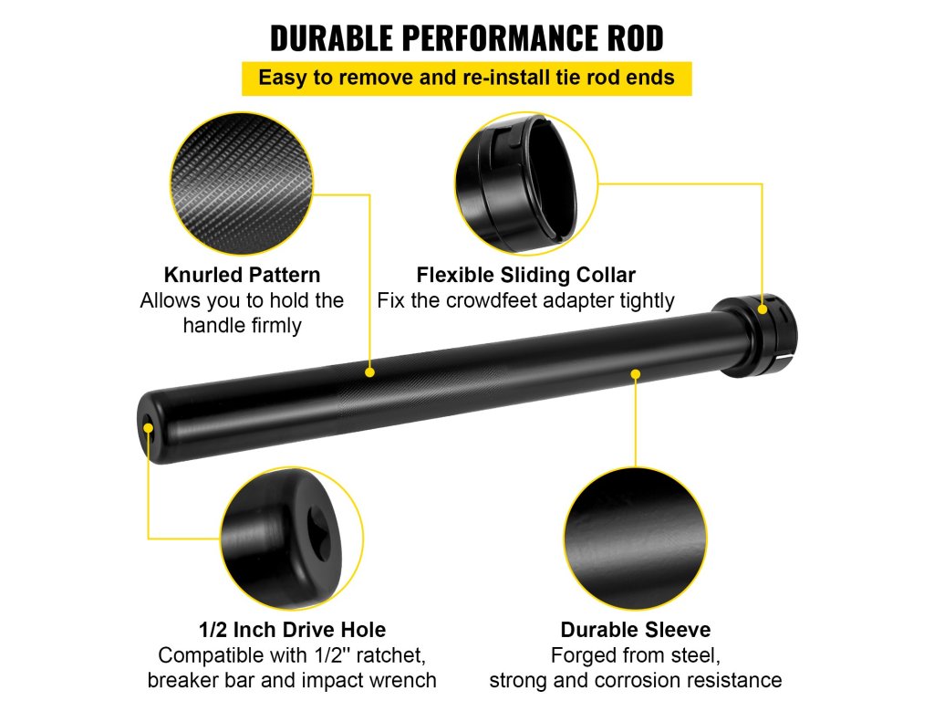 A belső nyakkendő rúd szétszerelő szerszámot a belső nyakkendő rúd biztonságos és gyors szétszereléséhez és összeszereléséhez tervezték. Kiválóan alkalmas személygépkocsik, pick-upok és terepjárók szervizeléséhez.