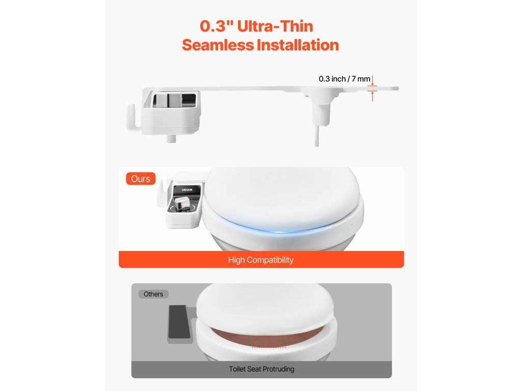 Ez a bidé WC-felszerelés elegáns, 0,3 hüvelykes, ultravékony profillal rendelkezik, amely a WC-ülőkével egy szintben illeszkedik. Nincsenek kínos rések - csak egy elegáns, modern kiegészítő, amely gyönyörűen illeszkedik bármely fürdőszobába.