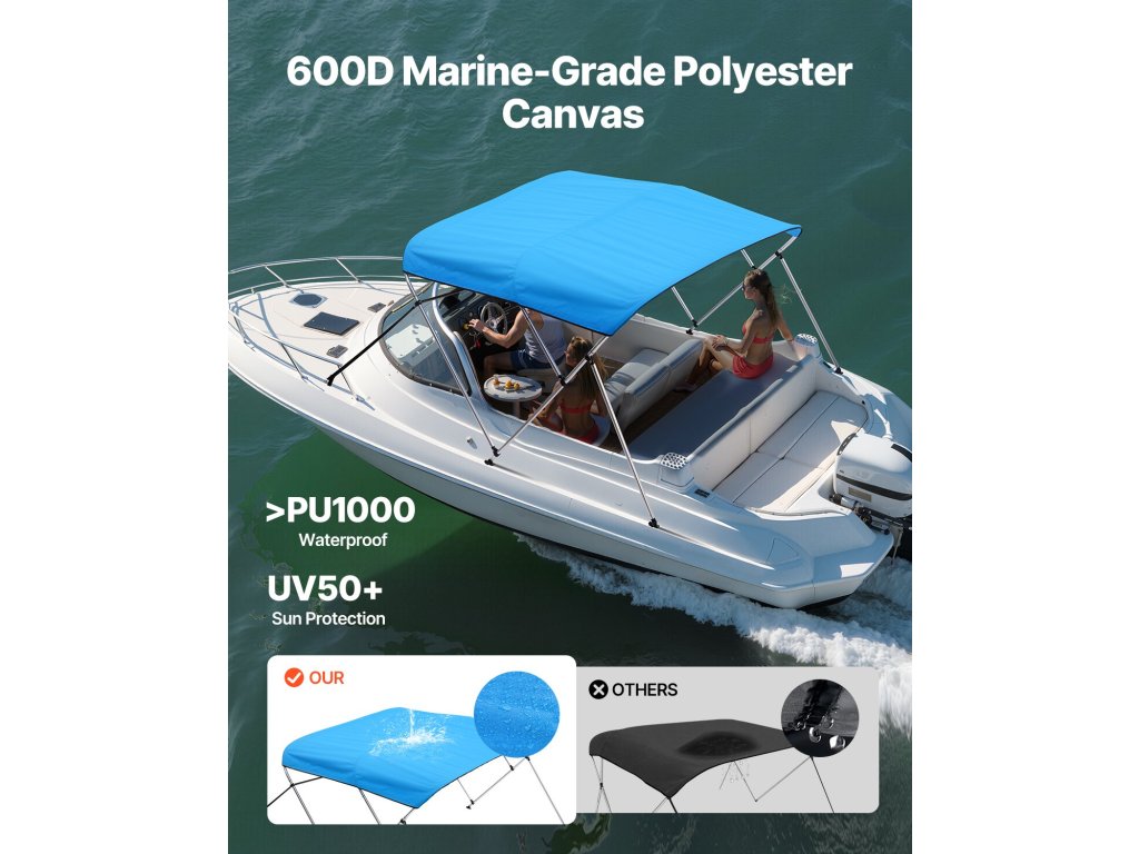 Az 1" vastag alumíniumötvözetből készült tartó rudakkal és tartós PP talppal ez a csónak bimini tető biztonságosan rögzül a hajójához. A korrózióálló anyagok biztosítják, hogy nem fog rozsdásodni a tengervíz vagy az eső miatt.