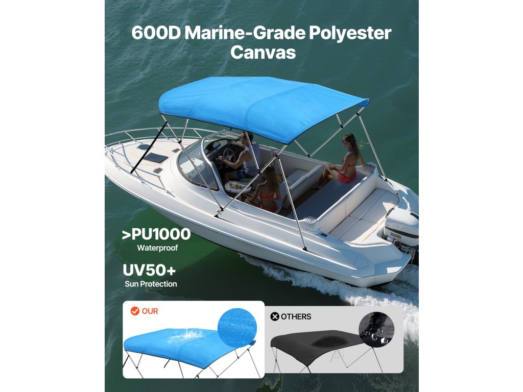 Az 1" vastag alumíniumötvözetből készült tartó rudakkal és tartós PP talppal ez a csónak bimini tető biztonságosan rögzül a hajójához. A korrózióálló anyagok biztosítják, hogy nem fog rozsdásodni a tengervíz vagy az eső miatt.