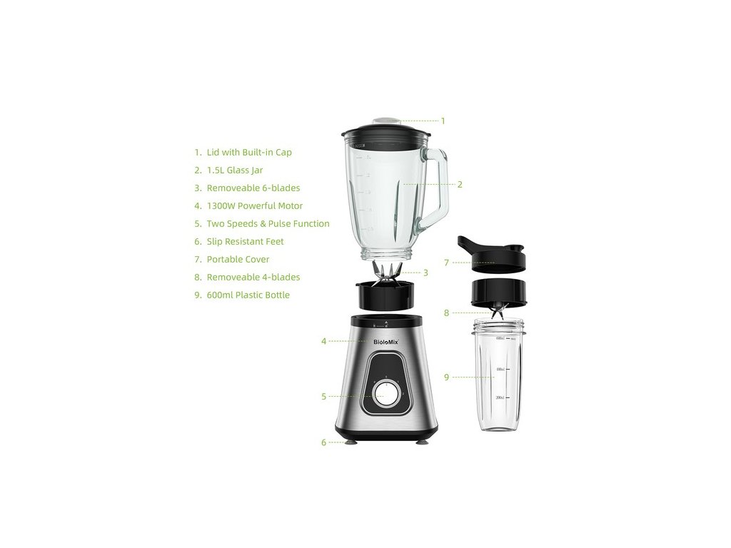 | A csomag tartalma: | Használati utasítás, turmixgép alap, 600 ml-es BPA-MENTES műanyag flakon, fedél és pengék, 1,5 l űrtartalmú üvegtartály |