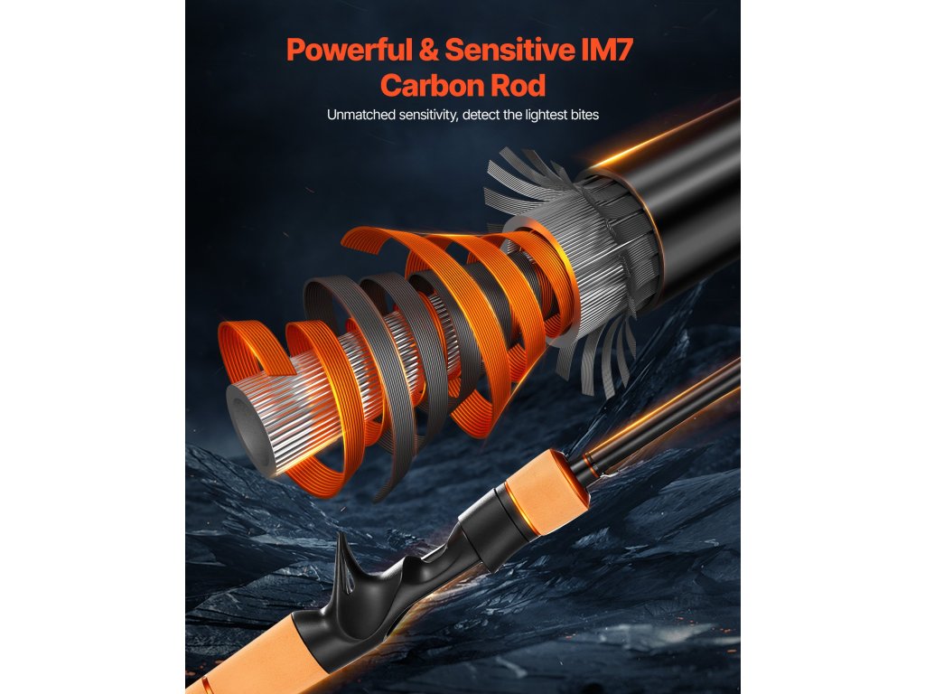 A tartós IM7 szénszálból készült bot kiváló hajlításállósággal rendelkezik, és kevésbé hajlamos a törésre. A könnyű szerkezet hosszú távú használathoz kényelmet biztosít, megkönnyíti az erős halhúzások kezelését, és fokozza az általános horgászélményt.