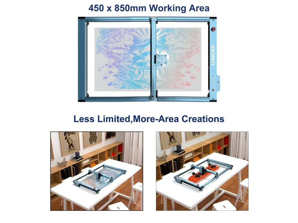 - Egyszerűen változtassa meg az Y-tengelyt, hogy a B1 20W/30W/40W lézergravírozó munkaterületét gyorsan 450*440mm²-ről 450*850mm²-re bővítse.