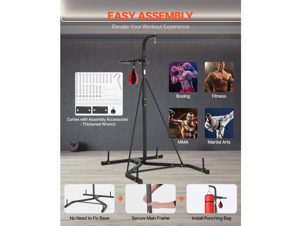 A homokzsák állvány nem igényel rögzítést a padlóhoz, csak rögzítse a fő keretet és szerelje fel a bokszzsákot. Használati utasításaink segítségével az állvány néhány perc alatt összeszerelhető. Az összeszerelési szerszámokat mellékeljük, és akár a nők által végzett külön szerelés is gyorsan elvégezhető.