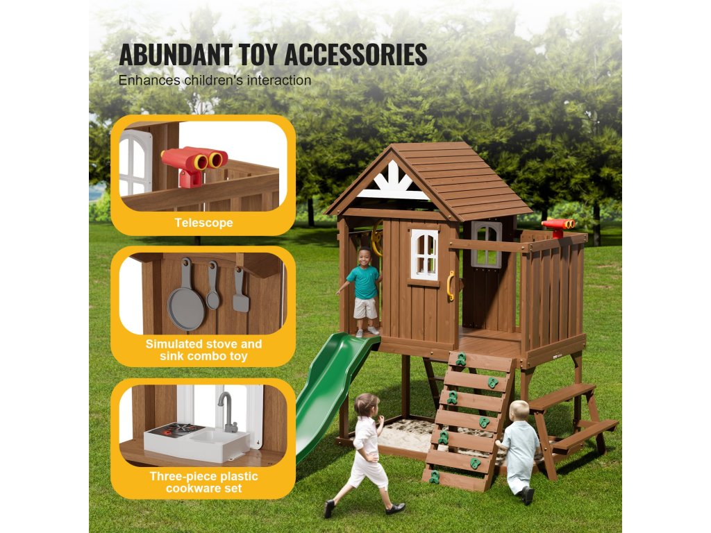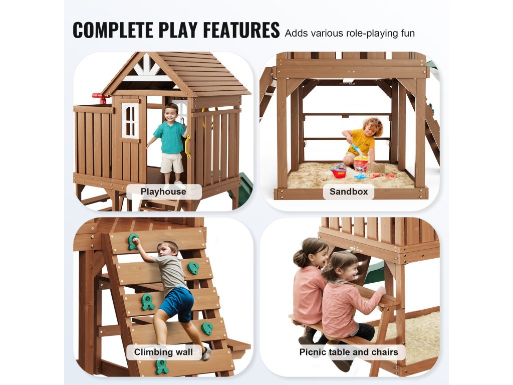 A fából készült játszóházhoz piknikasztal és pad tartozik, így a gyerekek a barátaikkal együtt fogyaszthatják el az uzsonnát, ami elősegíti a barátságot és a megosztási készségeket.
