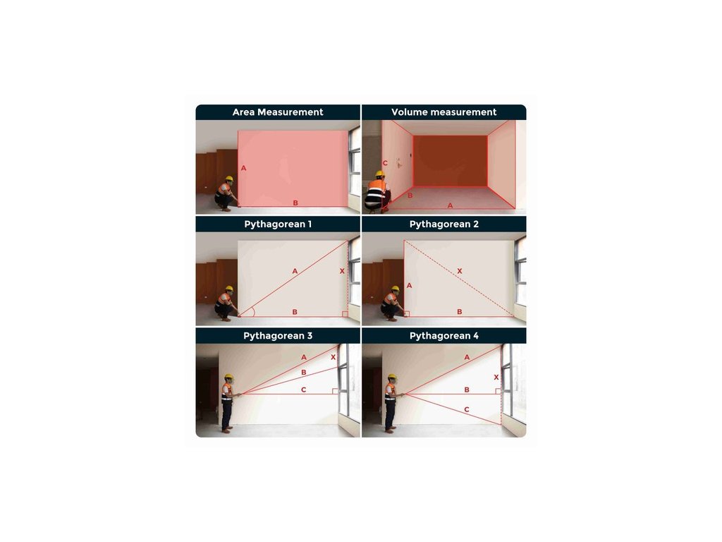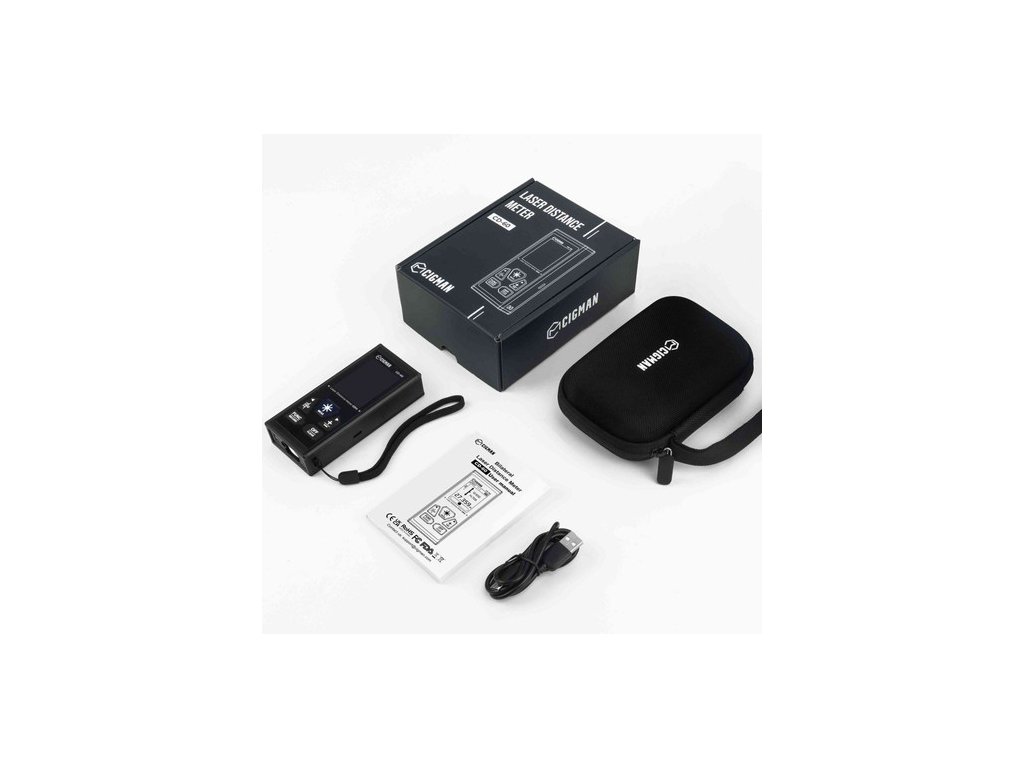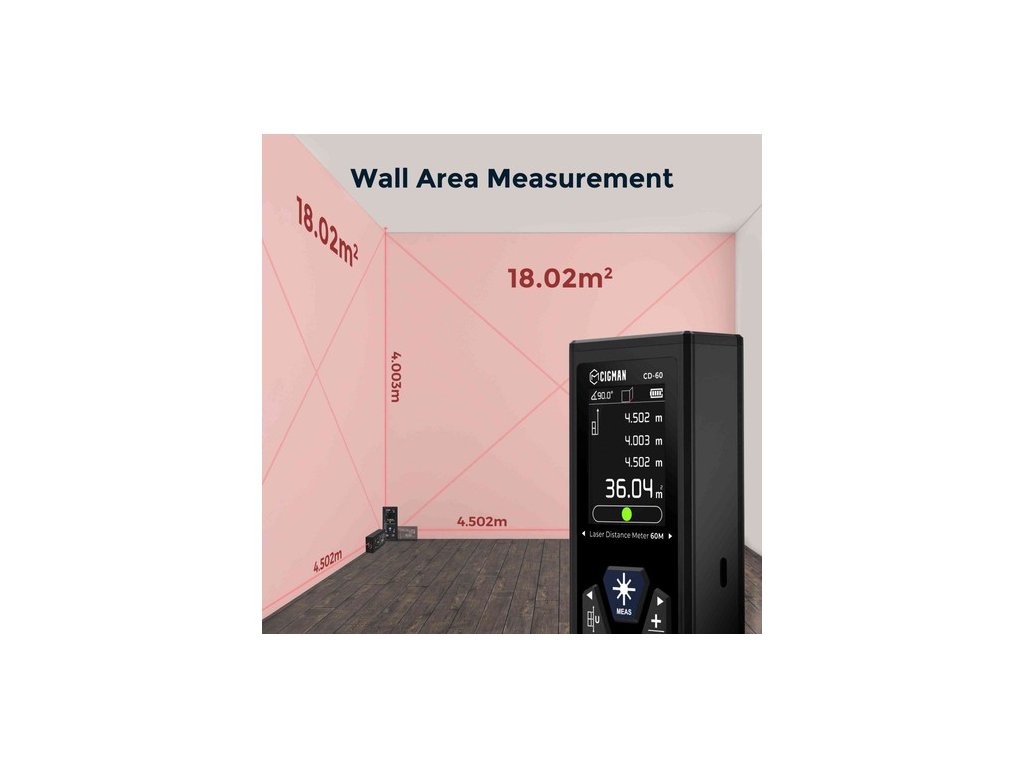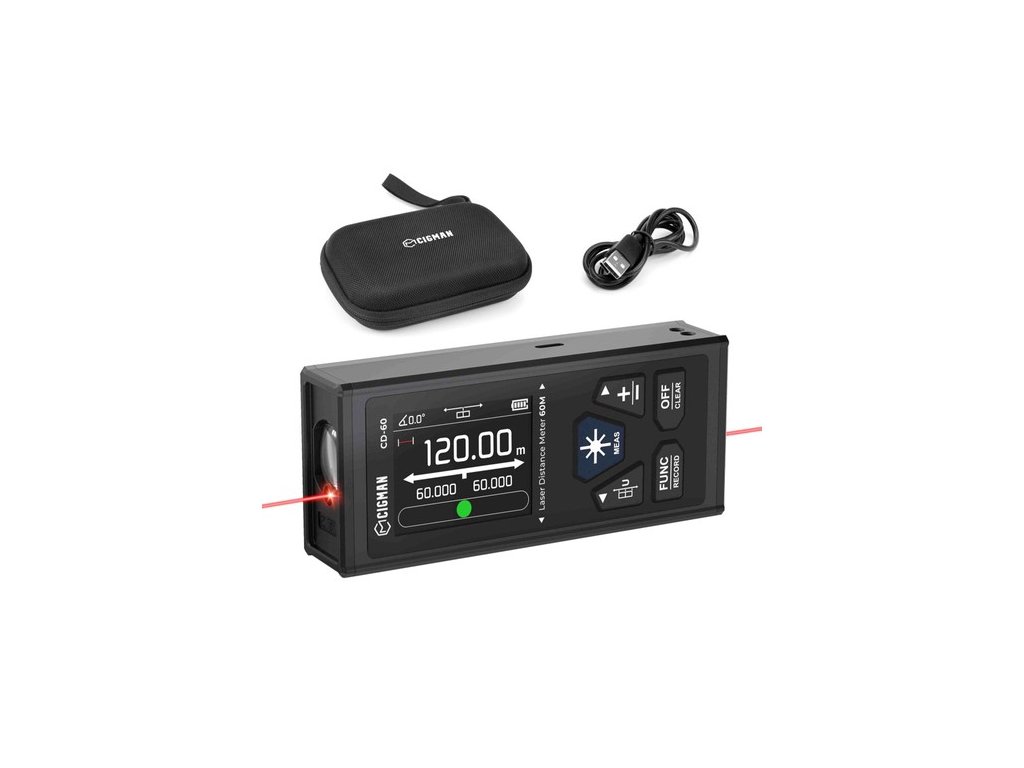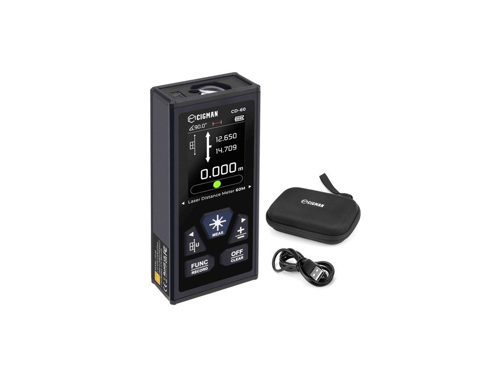 A CIGMAN CD-60 kettős lézeres távolságmérő képes kétirányú és egyirányú mérés között váltani, maximális mérési távolsága 393 láb (120 m), ±1/8 hüvelyk (3 mm) pontossággal (az egyirányú mérés 196 láb - 60 m). A távolságmérés során nem kell gyakran mozgatnia, ez segít a mérés gyors és pontos elvégzésében. (A CD-60 II. osztályú lézertermék, 1 mW teljesítményű)