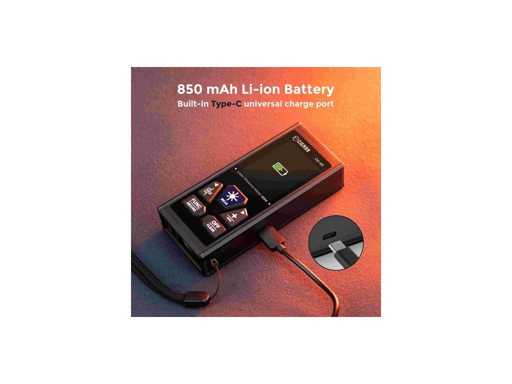 A CIGMAN CD-60 kétoldalas lézeres távolságmérő beépített újratölthető akkumulátorral van felszerelve, amely körülbelül 4 órán át tart, és teljesen feltöltve körülbelül 8000 folyamatos mérésre használható. A termék C típusú interfésze lehetővé teszi, hogy nagyon gyorsan feltölthető legyen. Ezt a kettős lézeres távolságmérőt könnyedén magával viheti az egész napos mérésekhez
