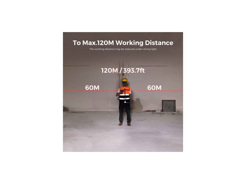 | Specifikáció | Maximális mért távolság: 60 m (egyirányú)/120 m (kétirányú) távolság Mérési pontosság: +(2mm+d*1/10000)*(egyirányú) Lézer típusa: 3,7 V 850 mAh lítium akkumulátor |