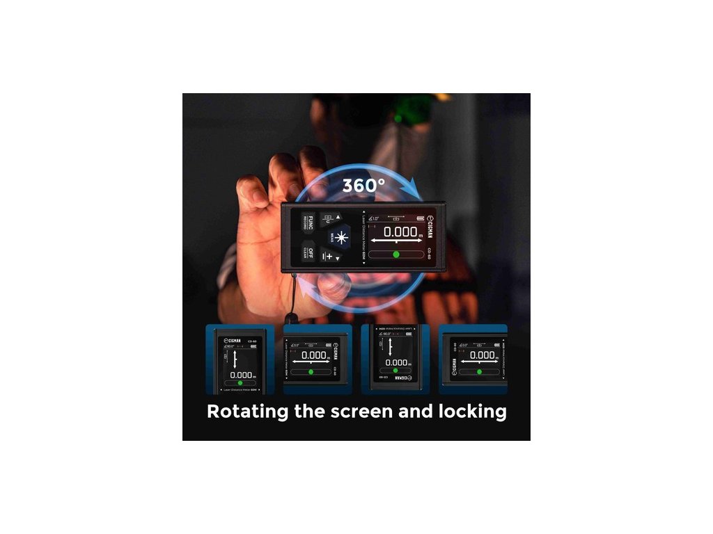 A CIGMAN CD-60 kettős lézeres távolságmérő 1,3 * 1,6 hüvelykes háttérvilágítású LCD-képernyővel rendelkezik, amely elég nagy a gazdag mérési információk egyidejű megjelenítéséhez. A háttérvilágítás funkció lehetővé teszi a világos leolvasást sötét körülmények között is. A készülék rendelkezik továbbá a képernyő lezárása és elforgatása funkcióval is. könnyen leolvashatja a mérési információkat, akár vízszintesen, akár függőlegesen tartja.