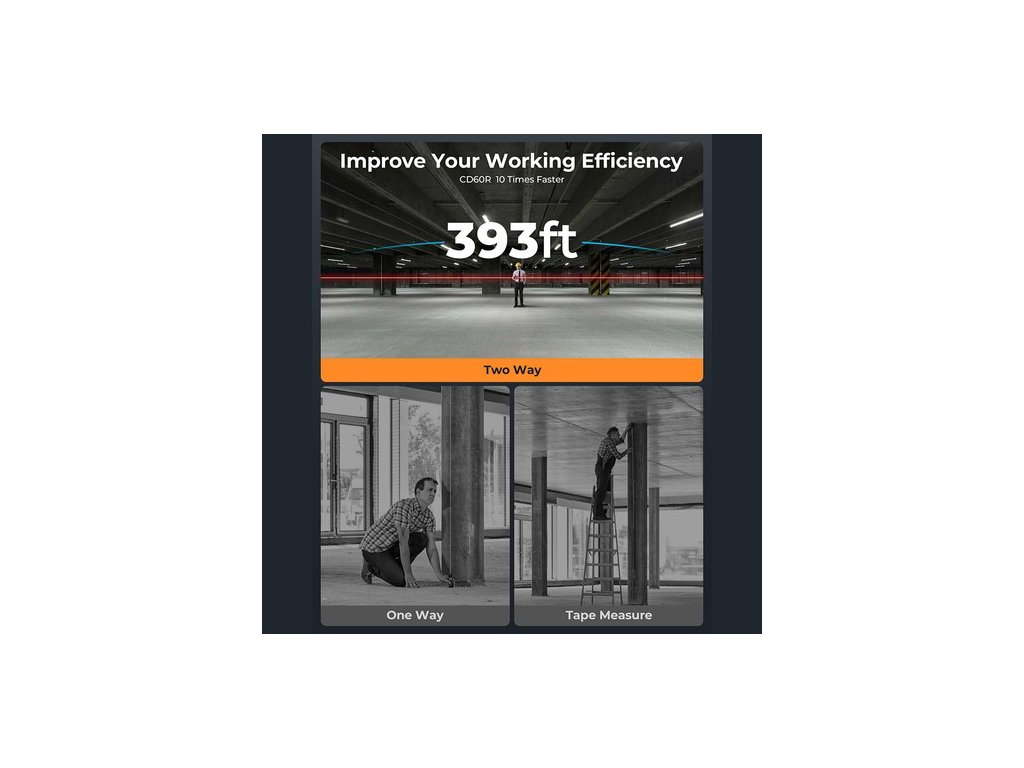 A mérőszalaggal összehasonlítva a CD-60R kettős lézeres távolságmérő eszköz 9 mérési módot biztosít, távolság, terület, térfogat, térfogat, szög, fal, közvetett mérés stb. A kapcsolható M/In/Ft egységek 100 adatfájlt tudnak tárolni a visszakereséshez, rendelkeznek összeadási és kivonási móddal a hatékony adatszámításhoz, valamint önkalibrációs móddal. Folyamatos méréssel könnyen megkaphatja az átlag-, a maximális és a minimális értékeket is.
