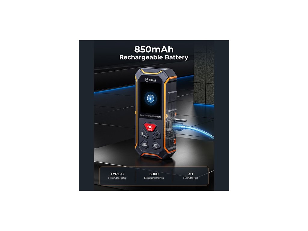 Kétoldalas lézeres mérőműszerünk beépített 850mAh-s újratölthető akkumulátorral rendelkezik, amely teljesen feltöltve 8000 mérésre képes egy irányban és 5500 mérésre két irányban; a C típusú töltőport gyors és kényelmes töltést tesz lehetővé, így egész nap használhatja anélkül, hogy aggódnia kellene az energia lemerülése miatt.