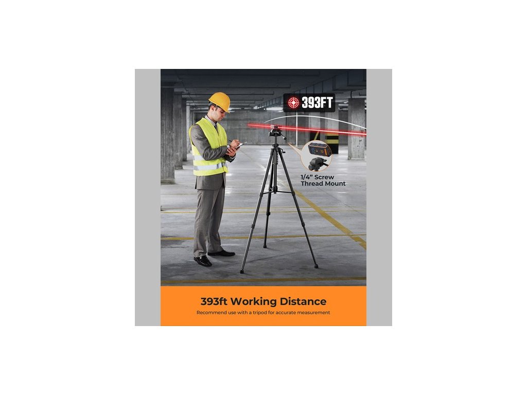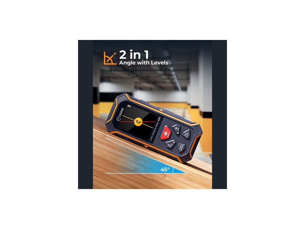 Ez a lézeres távolságmérő nagyméretű, színes háttérvilágítású LCD-kijelzővel rendelkezik, amely világos fényben és sötét környezetben is könnyen látható, és támogatja az automatikus elforgatást és rögzítést 4 különböző irányban a mért adatok könnyű leolvasása érdekében; ezen kívül egy elektronikus szögérzékelő segít a vízszintes irány gyors meghatározásában.