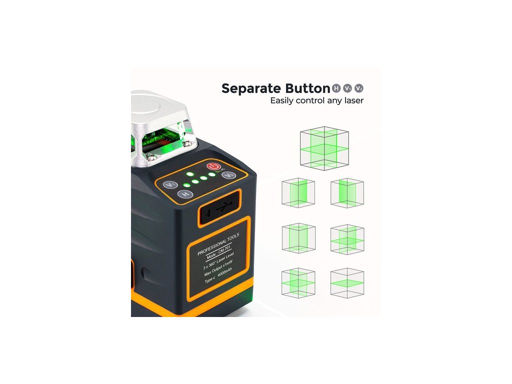 1x360° vízszintes vonal és 2x360° függőleges vonal az egész helyiséget lefedi. Minden gomb ezen a lézerszinten egy lézervonalnak felel meg, egyszerűen kiválaszthatja, hogy bármelyik lézervonalat be/ki akarja-e kapcsolni.