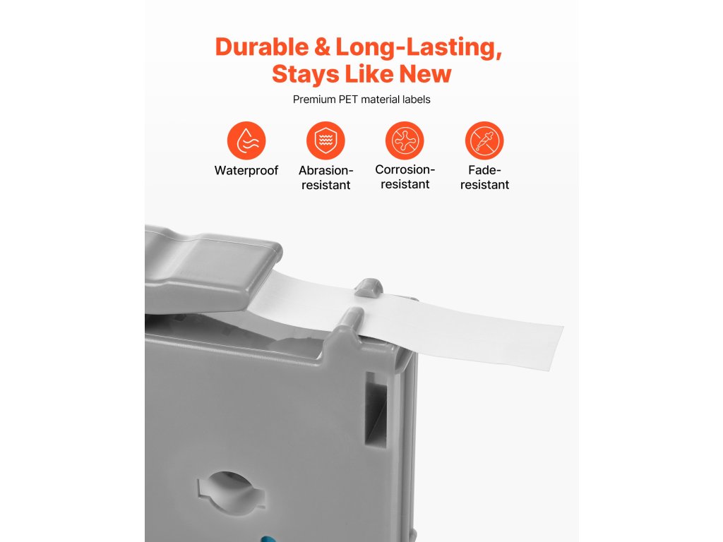 Ez a címkekazetta úgy készült, hogy tartósan bírja a zord környezetet, és ellenáll a víznek, a kopásnak, a korróziónak és a fakulásnak. Erős ragasztóval rendelkezik, amely lehúzáskor nem hagy maradványokat.