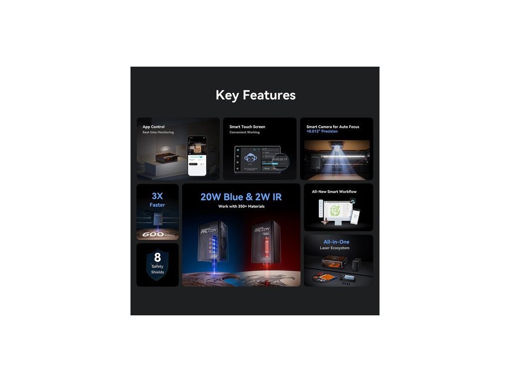 A nagy teljesítményű 20 W-os kék lézermodullal felszerelt Falcon A1 Pro könnyedén kezeli a fát, akrilt, rozsdamentes acélt, bőrt, szövetet és még sok mást. Ön elképzeli a projektet, a Falcon megvalósítja azt!