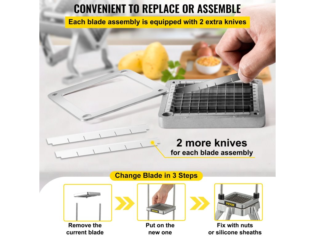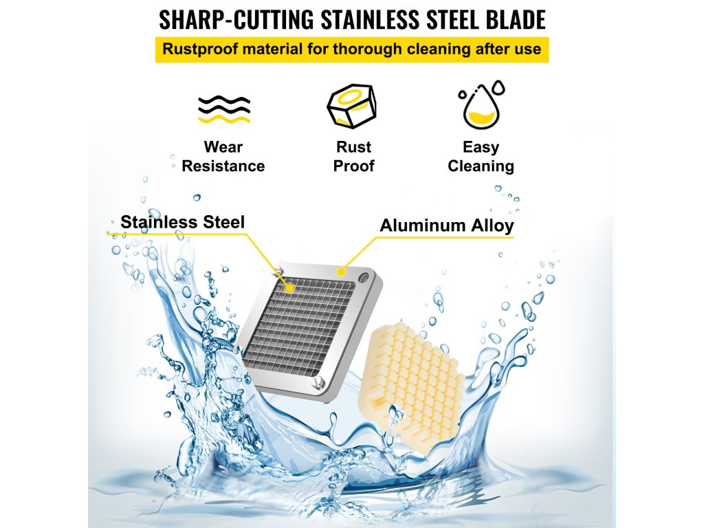 A hagyományos kézi késsel történő szeleteléssel ellentétben ez a vágókés hatékonyan képes akár 1/4 hüvelykes csíkokat és kockákat is készíteni, így időt és energiát takaríthat meg az ételkészítéssel.