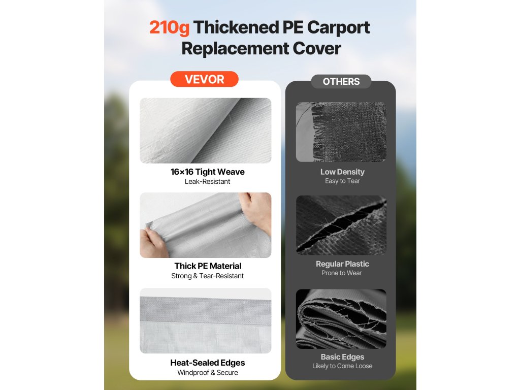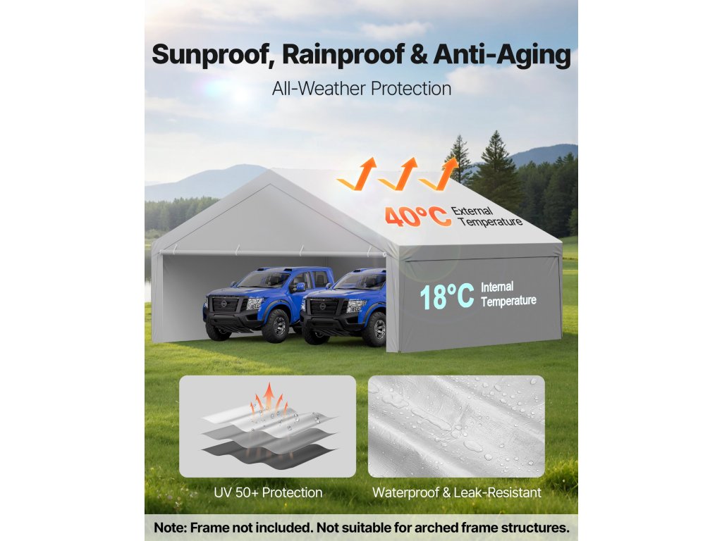 A szabványos 20×20 láb méretű csere autóbeálló fedelet úgy tervezték, hogy illeszkedjen a legtöbb autóbeálló kerethez. A könnyű cseréhez nincs szükség vágásra vagy módosításra. Tökéletes a gyors barkácsolt cserékhez.