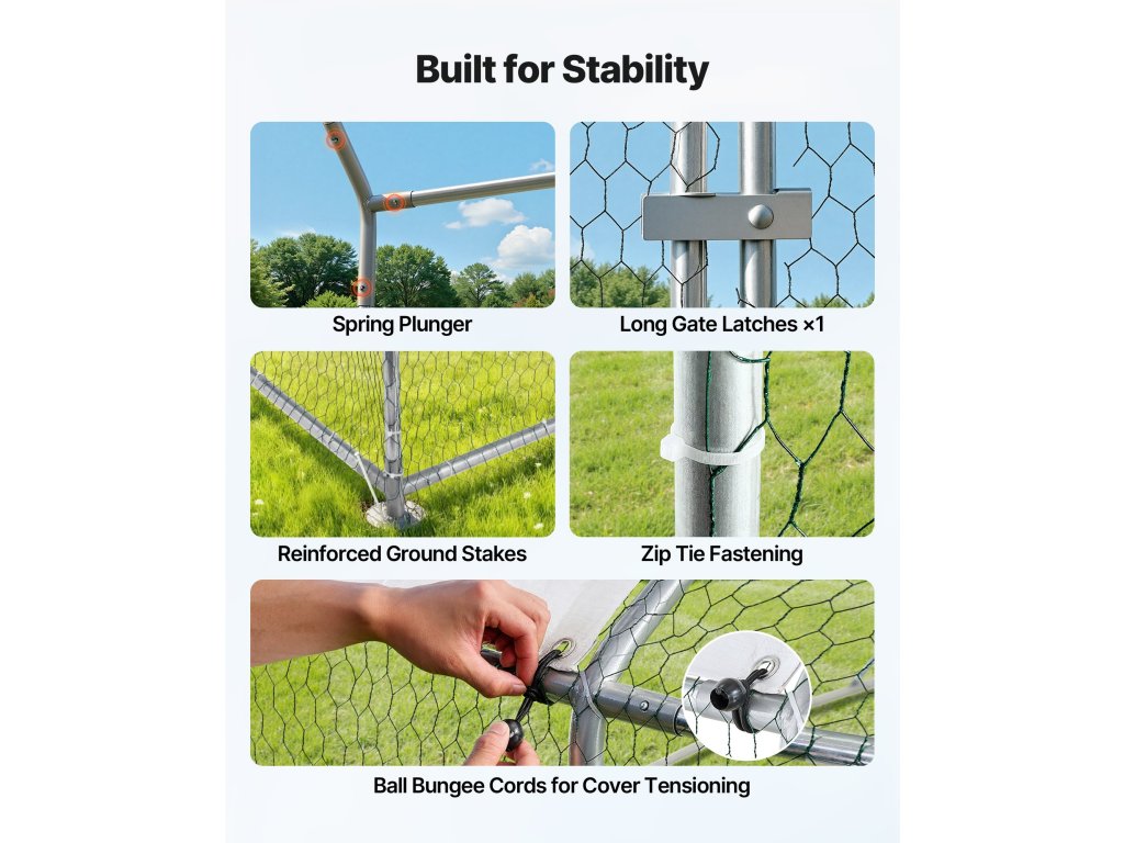 Fém csirketárolónk horganyzott acélcsőből készült, a korrózió megelőzése érdekében sós permetezéssel tesztelt. Biztonságos és hangulatos, kiváló minőségű otthont biztosít csirkéinek, esőben vagy napsütésben.