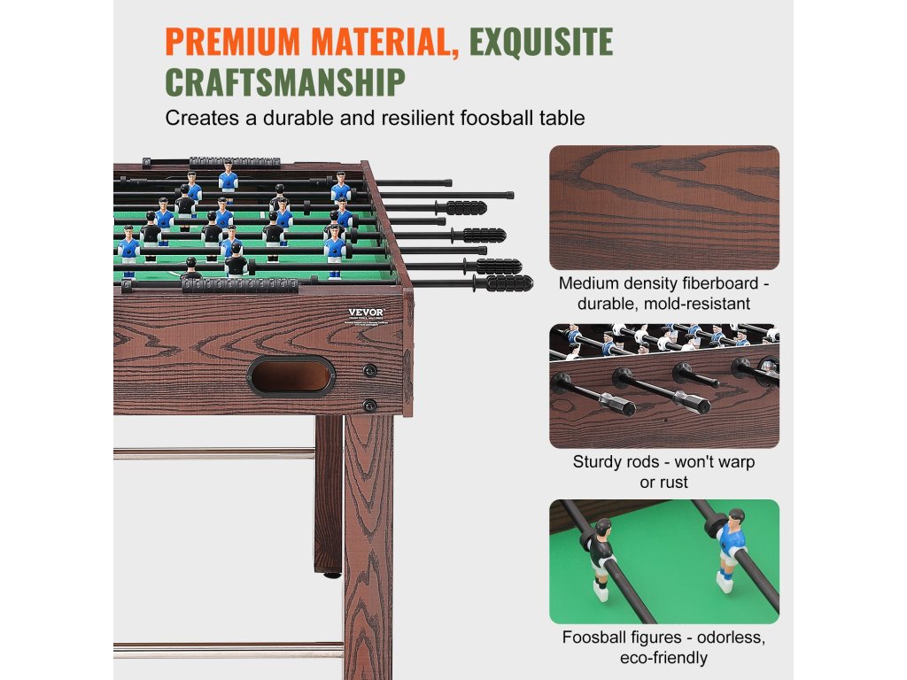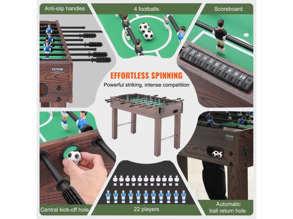 Az asztali labdarúgás gyors átmenetet biztosít a támadásra és a védekezésre, izgalmas összecsapásokat kínál, és próbára teszi a játékosok gyors reflexeit és a kéz-agy koordinációt. Rendkívül interaktív, 2-4 játékos számára alkalmas, a szabadidő és a szórakozás terét teremtve.