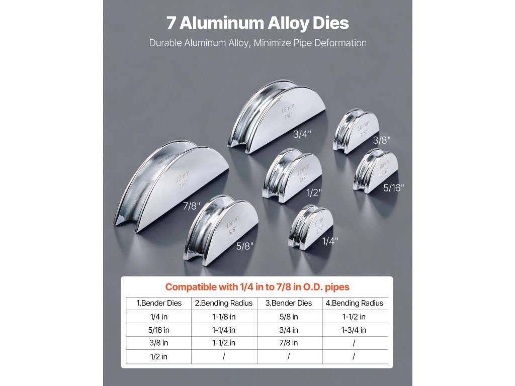 Ez a racsnis kézi csőhajlító 7 anyával rendelkezik, amelyek lehetővé teszik a réz- és alumíniumcsövek pontos hajlítását 1/4 hüvelyk és 7/8 hüvelyk (6-22 mm) átmérő között. A 0°-tól 90°-ig terjedő hajlítási szögekkel ideális a légkondicionáló berendezések beszereléséhez, autójavításhoz és otthoni használatra. A kompakt kialakításnak köszönhetően könnyen szállítható és tárolható.
