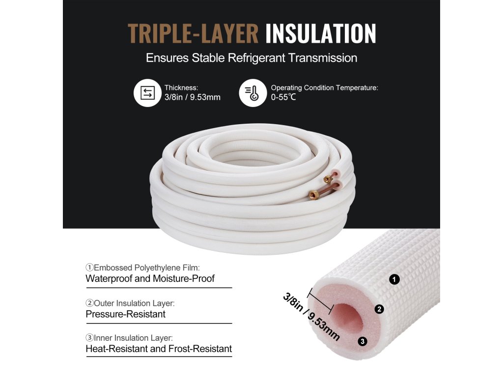 A belső rézcsövek jobb védelme érdekében a VEVOR a hagyományos kétrétegű szigetelőanyagokkal szemben háromrétegű szigetelőanyagokat használ a kiváló szigetelési tulajdonságok érdekében. A dombornyomott felületkezelés növeli a tartósságot és tagadhatatlan szilárdságot mutat.