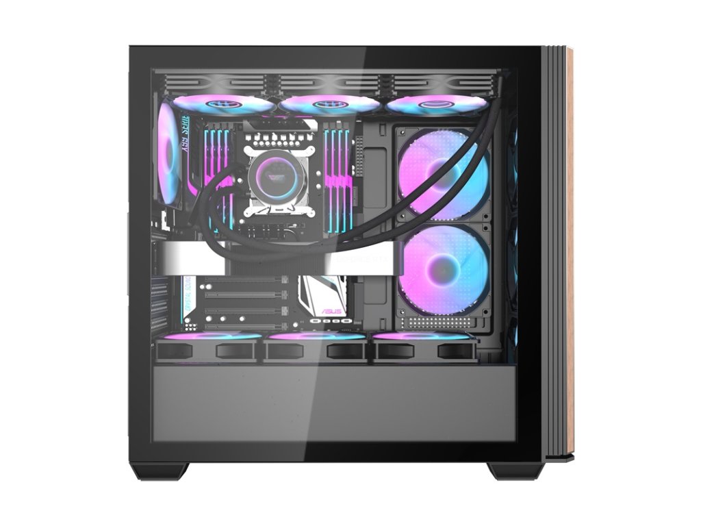A Darkflash DS900WS egy modern megoldás az igényes felhasználók számára, akik értékelik az esztétikát és a funkcionalitást. A jellegzetes, A-oszlop nélküli panorámakialakítású, egyetlen átlátszó üvegfallal, valamint fa és fém előlappal rendelkező készülék nemcsak lenyűgözően néz ki, hanem kiváló láthatóságot is biztosít az alkatrészek számára. A tokot úgy tervezték, hogy optimális hűtést, teljesítményt és sokoldalúságot biztosítson, miközben a számítógépes rendszerek egyszerű módosítását és bővítését teszi lehetővé. A készlet 4 ventilátort tartalmaz.