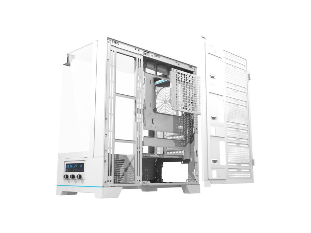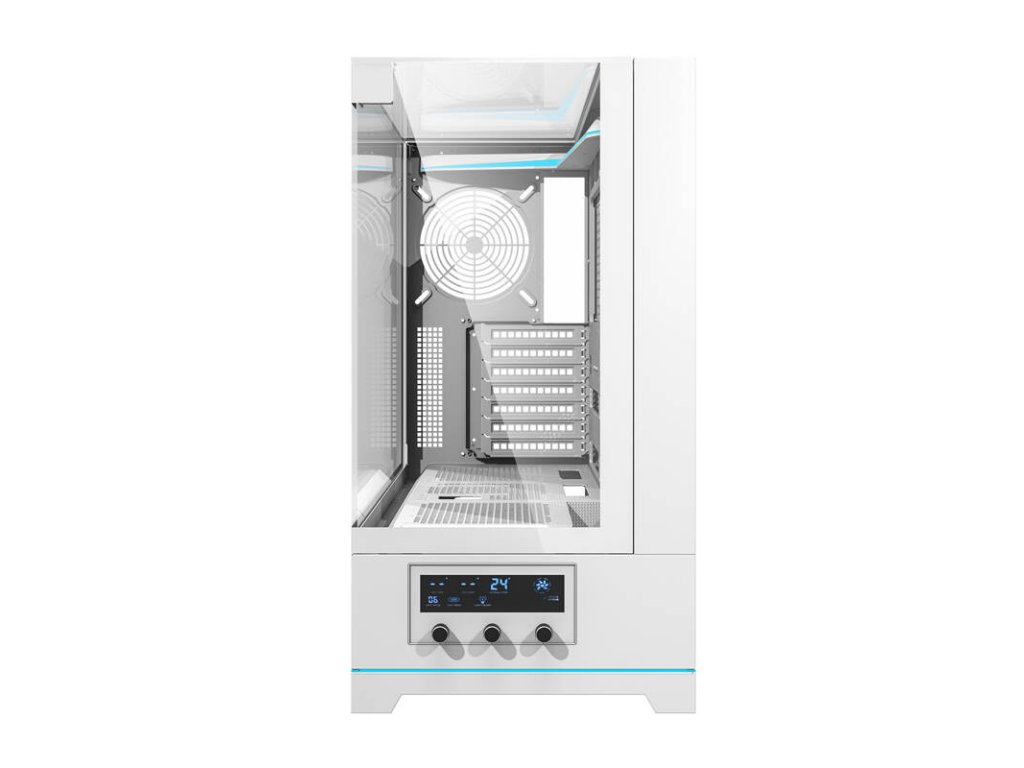 A ház két USB 3.0 portot, egy USB Type-C portot és egy HD audiocsatlakozót kínál a perifériák kényelmes csatlakoztatásához. A ventilátorok sebességét vezérlő gombok jelenléte viszont lehetővé teszi a hűtőrendszer teljes körű vezérlését.