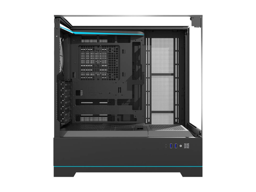 A ház két USB 3.0 portot, egy USB Type-C portot és egy HD audiocsatlakozót kínál a perifériák kényelmes csatlakoztatásához. A ventilátorok sebességét vezérlő gombok jelenléte viszont lehetővé teszi a hűtőrendszer teljes körű vezérlését.