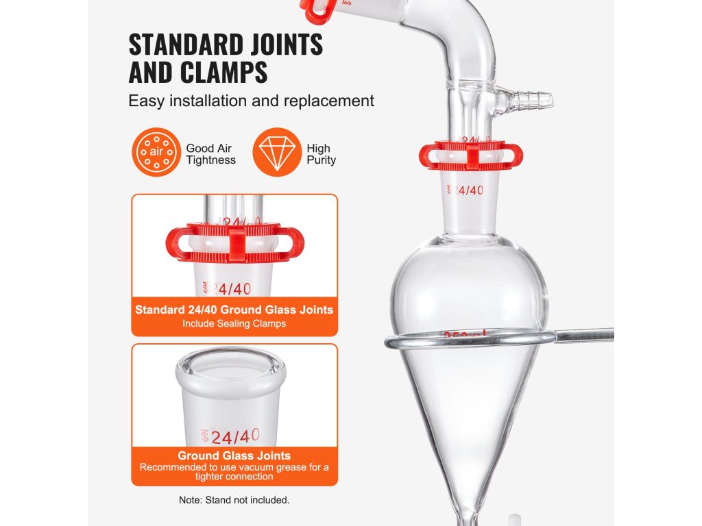 Szabványos 24/40 csatlakozók a könnyű felszerelés és csere érdekében. A földelt kötéses kialakítás jobb légzárást biztosít, biztosítva a tiszta desztillációt.