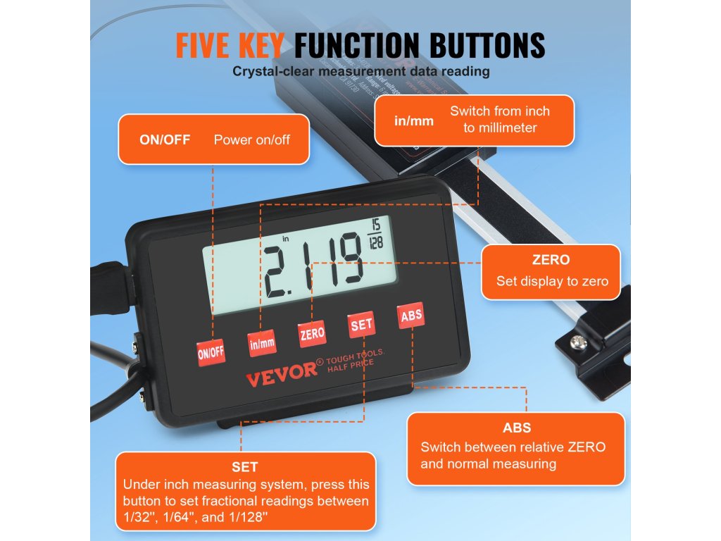 Kompakt kijelzőegységünk 5 alapvető funkciógombbal büszkélkedhet, amelyek lehetővé teszik a gyors váltást hüvelykről milliméterre, a precíziós beállítást, a relatív NULLÁT és a normál mérést. Tapasztalja meg a leolvasási kényelmet.