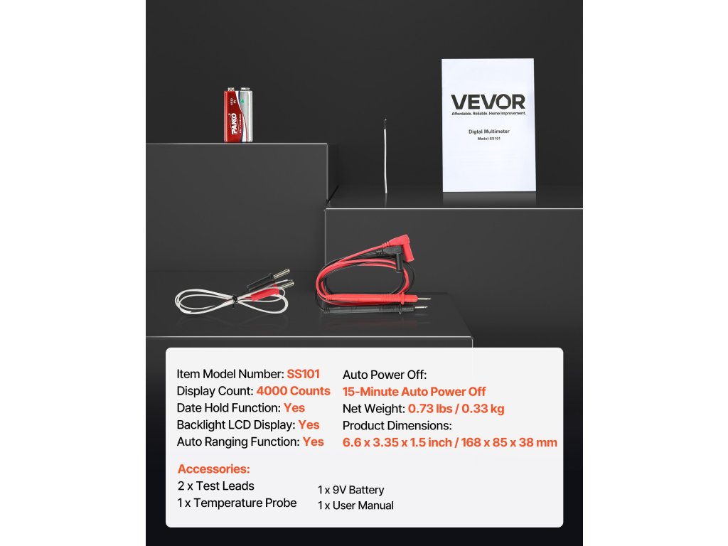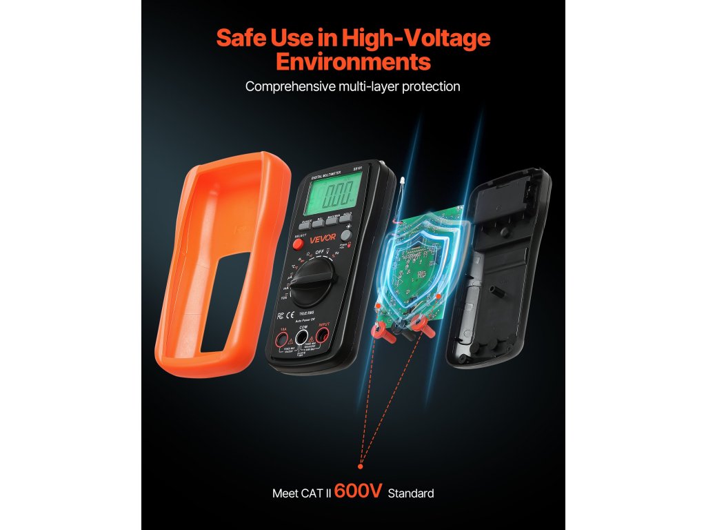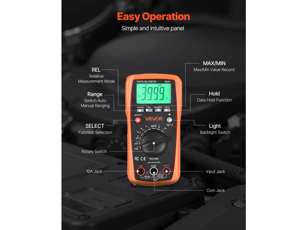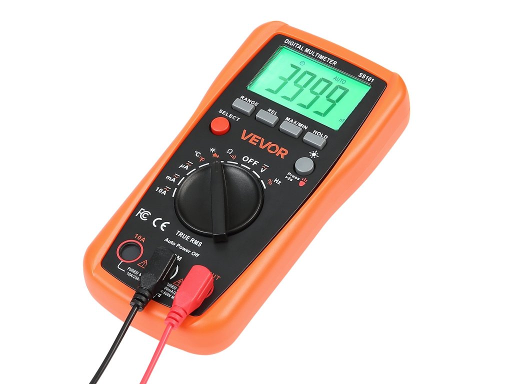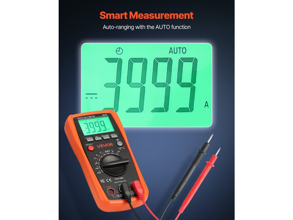 A VEVOR 4000 TRMS digitális multiméter támogatja az áram, a feszültség, az ellenállás, a kapacitás, a frekvencia, a hőmérséklet, a diódák, a folytonosság és az üzemidő vizsgálatát. Az Auto Ranging és True RMS technológiával pontosan képes a nem szinuszos hullámformák valódi effektív értékének mérésére.