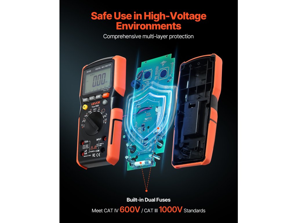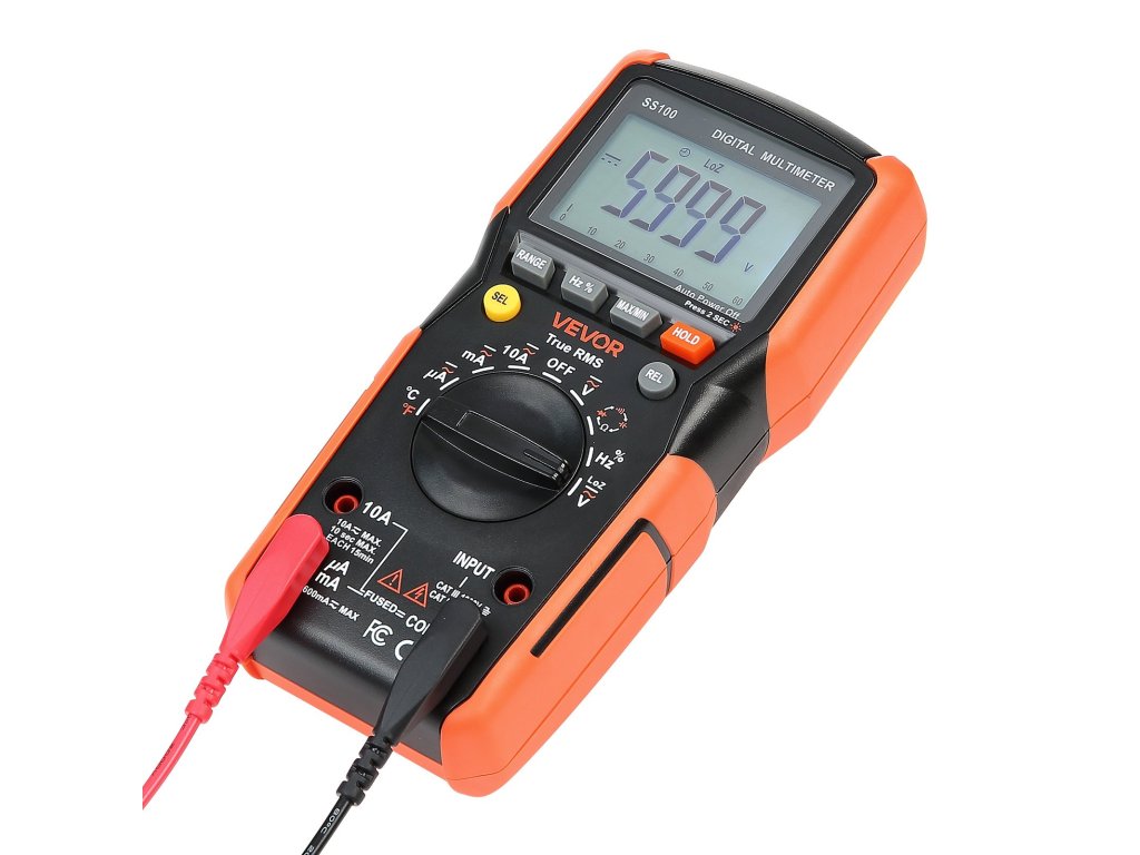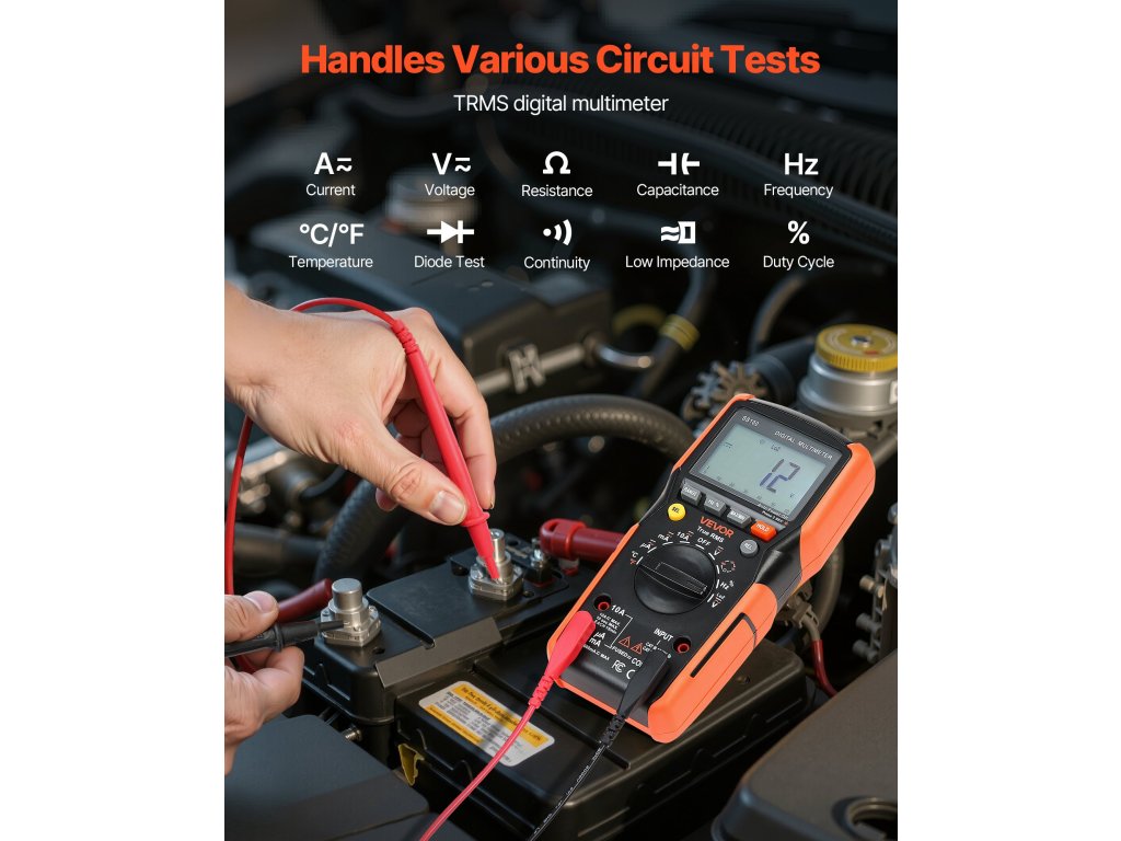 A VEVOR 6000 digitális TRMS multiméter támogatja az áram, feszültség, ellenállás, kapacitás, frekvencia, hőmérséklet, diódák, folytonosság, alacsony impedancia és munkaciklus vizsgálatát. Az Auto Ranging és True RMS technológiával pontosan mérheti a nem szinuszos hullámformák valódi effektív értékét.