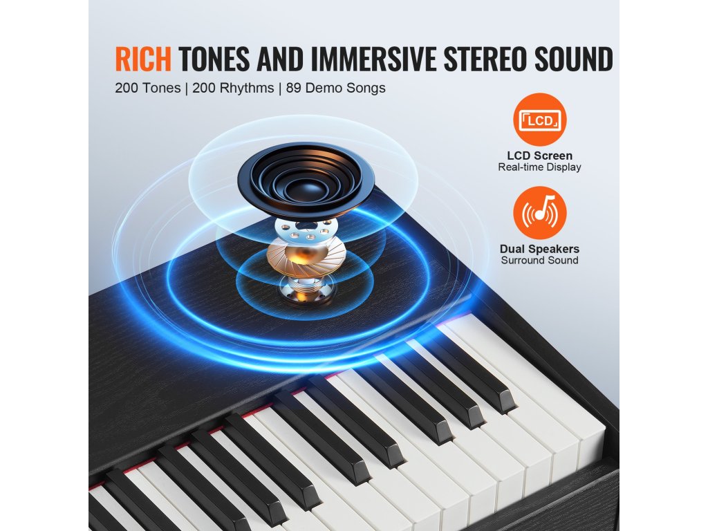 Ez a 88 billentyűs, teljesen súlyozott digitális zongora minden billentyűhöz egyedi súlyokkal rendelkezik, és a kettős billentyűzet üzemmódban 200 hangjegyet játszik. Kettős hangszórók, MIDI és Bluetooth átviteli támogatás, audio- és mikrofoncsatlakozókkal. Dupla zongorapad, két ember együtt ülhet, ha együtt játszanak.