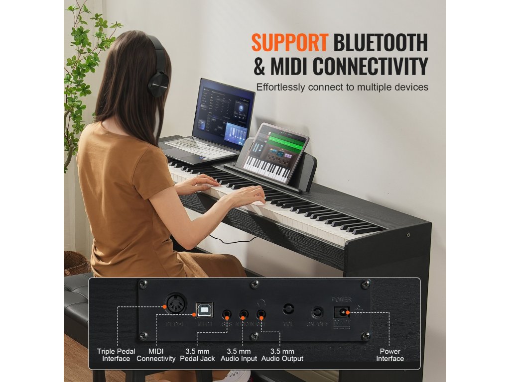 Az elektromos zongora támogatja a bluetooth interfészt és a MIDI átvitelt. Több interfész is rendelkezésre áll, így hozzáférhet a sustain pedálhoz, fejhallgatóhoz, mikrofonhoz, számítógéphez stb., hogy könnyedén szerkeszthesse és létrehozhassa zenéjét.