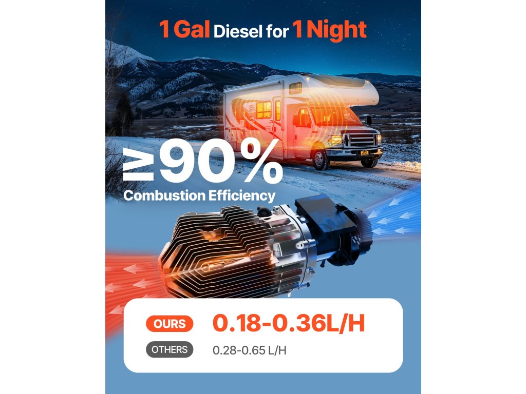 Nem kell aggódnia a túlzott üzemanyag-fogyasztás miatt a lakóautóval tett hosszú terepjárós utazások során. Dízel légfűtésünk lenyűgöző, ≥ 90%-os üzemanyag-hatékonysággal büszkélkedhet, így biztosítva, hogy a gázolaj minden cseppje teljes mértékben hasznosuljon. Mindössze 1 gallon dízel üzemanyag szükséges az egész éjszaka fűtéséhez.