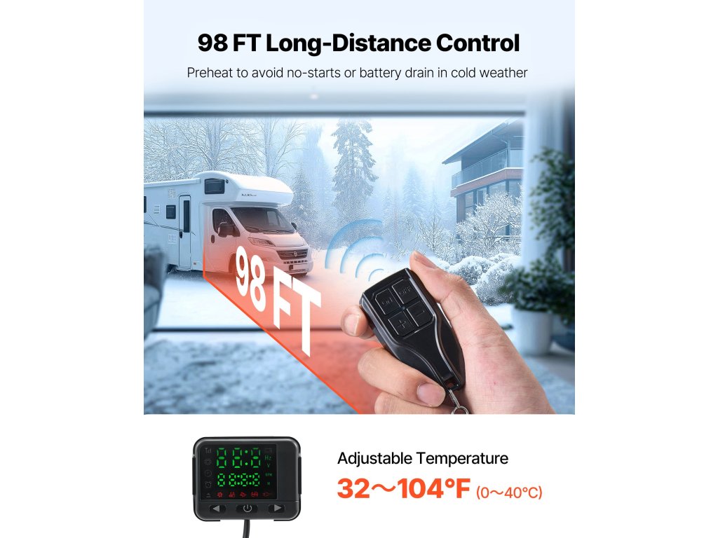 Parkoló dízel fűtőberendezésünkhöz egy 98 láb hosszú távirányító tartozik, amellyel távolról is módosíthatja a beállításokat és élvezheti a hőt. Irányítsa a kényelmet anélkül, hogy elhagyná az ülését, az LCD-kijelző pedig egyértelmű és felhasználóbarát kezelőfelületet biztosít.