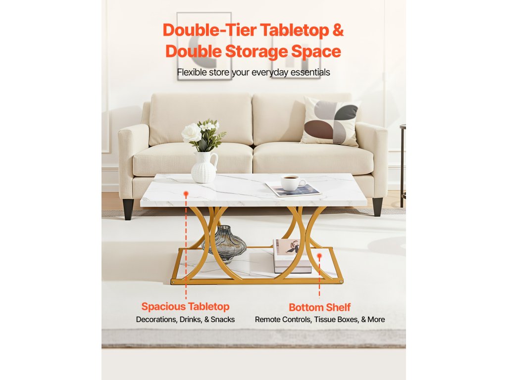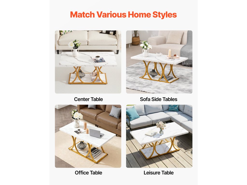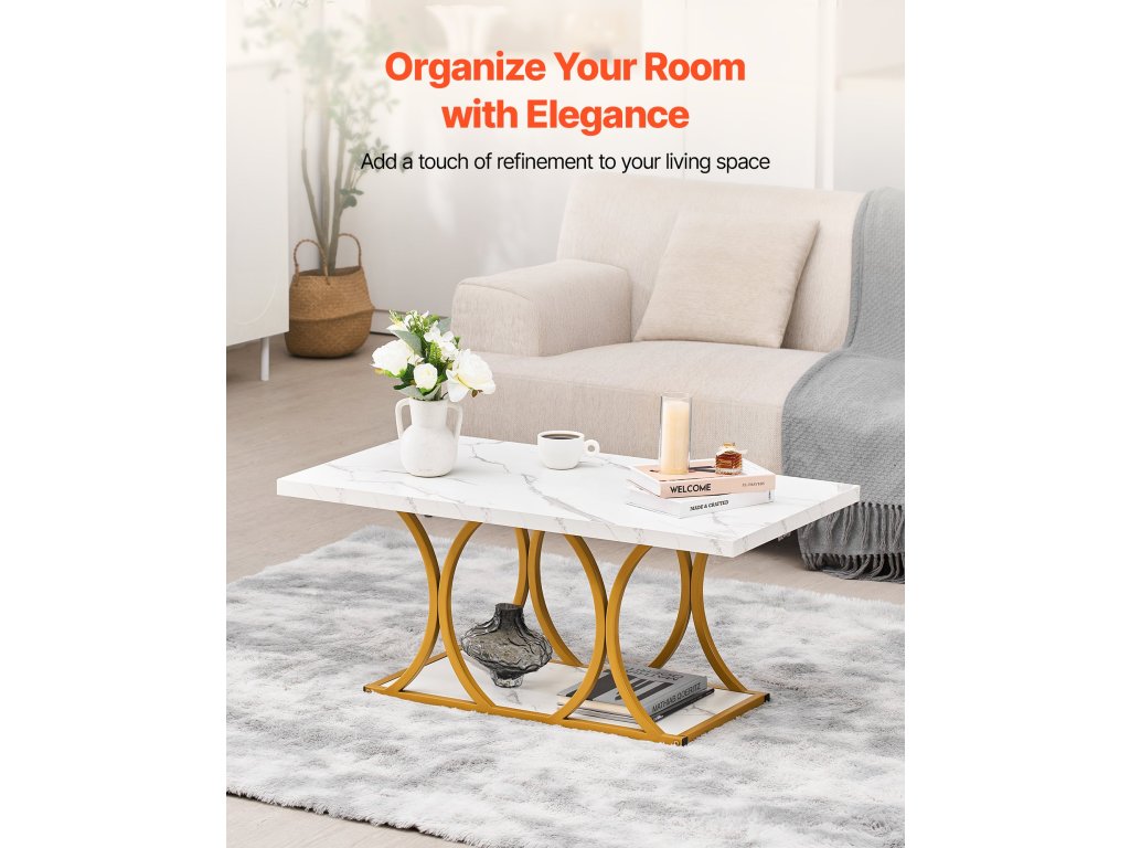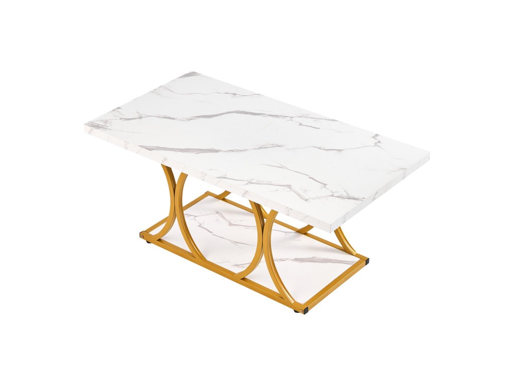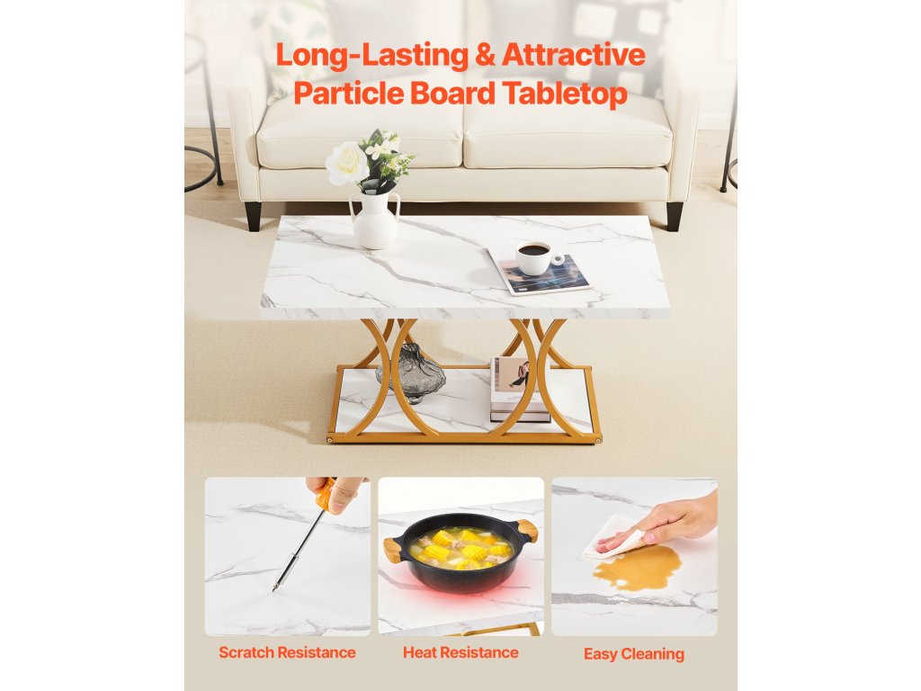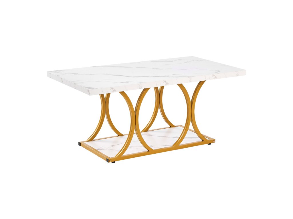 Ez a fából készült dohányzóasztal klasszikus műmárvány felülettel rendelkezik, amely víz- és kopásálló, és csak egyszerű karbantartást igényel, hogy megőrizze friss megjelenését. A geometrikus fémkeret egyedi ipari-modern jelleget kölcsönöz az asztalnak, amely zökkenőmentesen illeszkedik a modern, rusztikus vagy vintage enteriőrökbe.