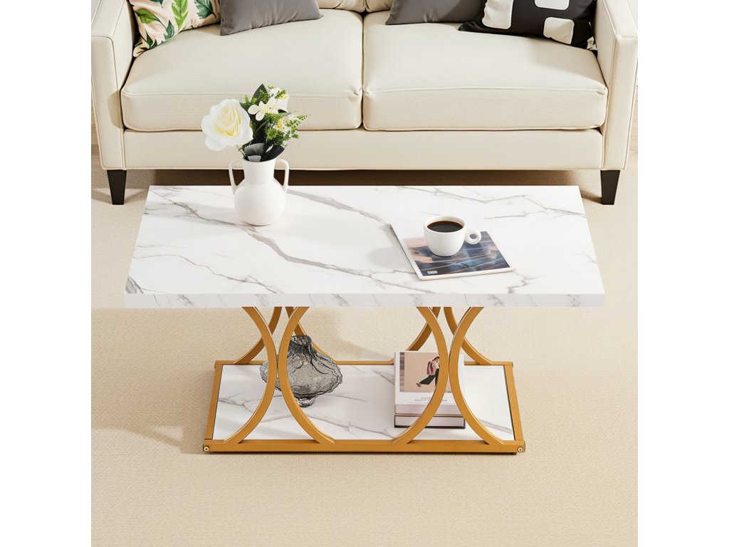 Dohányzóasztal műmárvány tetejjel, 2 polccal, fém vázzal, fehér