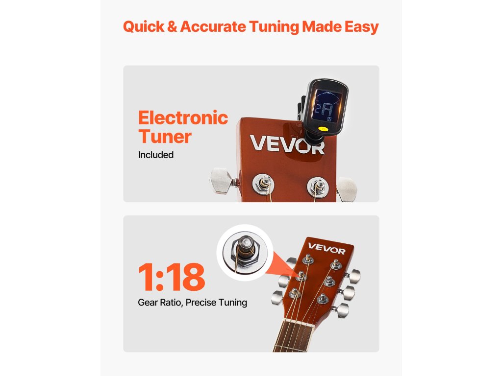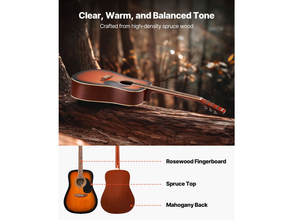 A lucfenyő tetővel és mahagóni testtel ellátott akusztikus gitárunk meleg, telt hangzást biztosít, amely bármilyen stílushoz illik. Mérete alkalmas idősebb, némi tapasztalattal rendelkező játékosok számára. Gyorsan hangolható, vízálló, tartós oxfordi gigatáskával és minden lényeges tartozékkal érkezik.