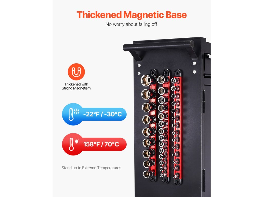 A VEVOR fiókszervező készlet 360°-ban forgatható klipszekkel rendelkezik a szerszámokhoz való könnyű hozzáférés érdekében, és több fiókmárkával kompatibilis, hogy munkaterületét rendben tartsa. Erős mágneses alapja számos fémfelületre képes rátapadni, így gyors és hordozható beállítást biztosít a hatékonyabb feladatok elvégzéséhez.